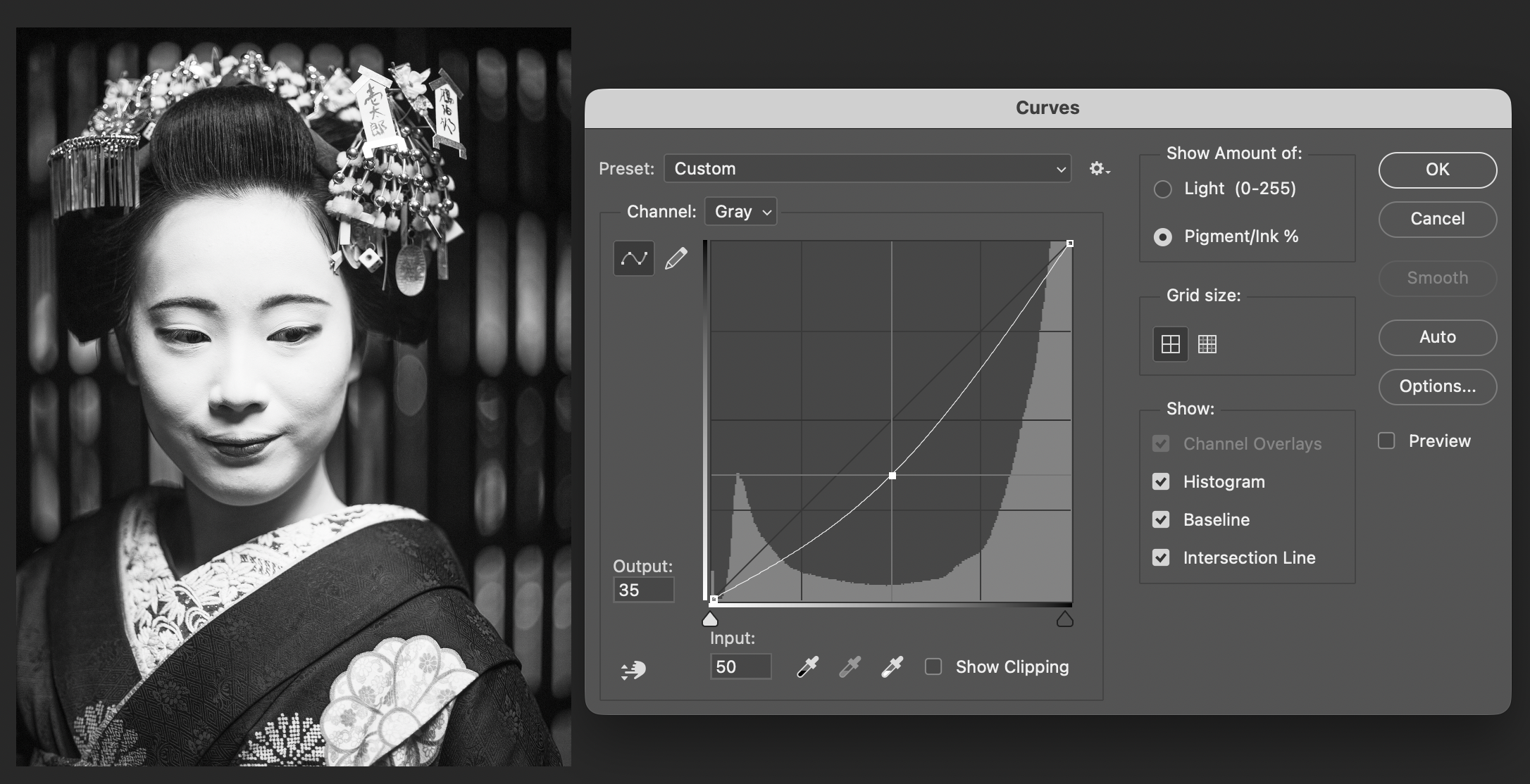 Creating a 15% dot gain curve to reduce midtone density for the black ink channel. This is done to compensate for the ink spreading (dot gain) that occurs when paper absorbs ink.