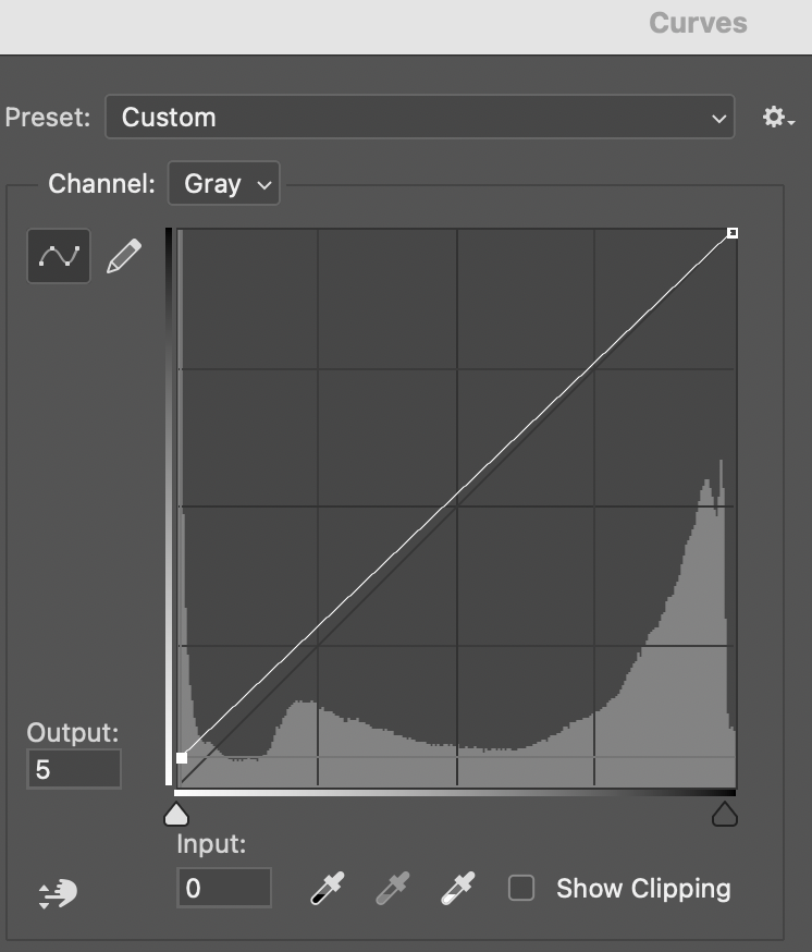 To apply the highlight cut, place your mouse cursor at the bottom left side of the curve, and drag the “output” setting up from 0 to 5, as seen in this screenshot:
