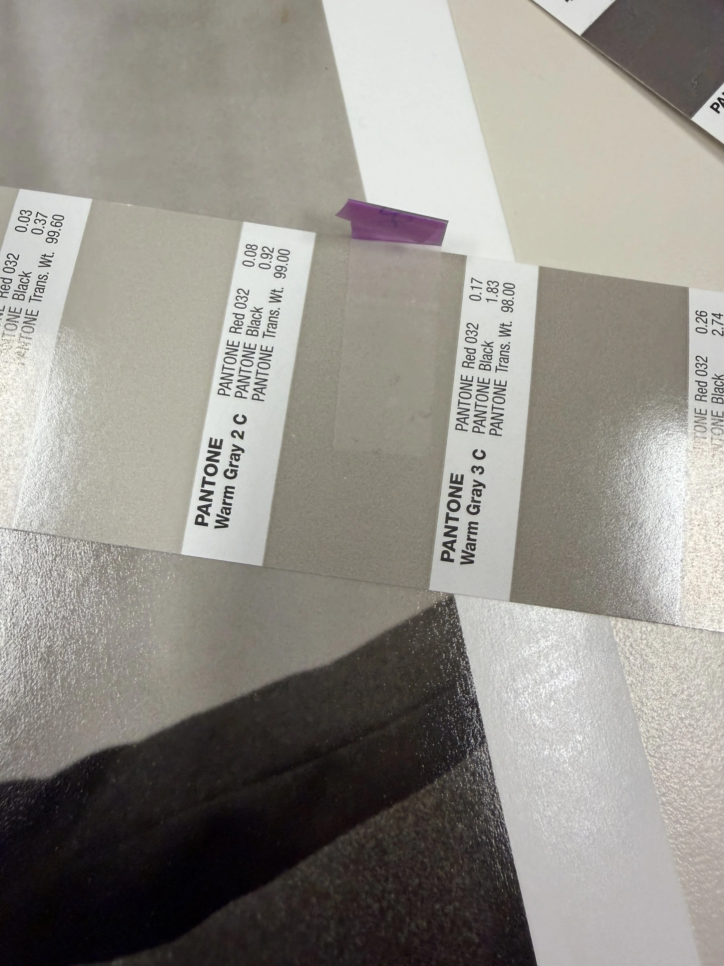 The print sits below the Pantone color bridge guide. In this case, we decided that Pantone Warm Gray 3C was a close, if not perfect match.