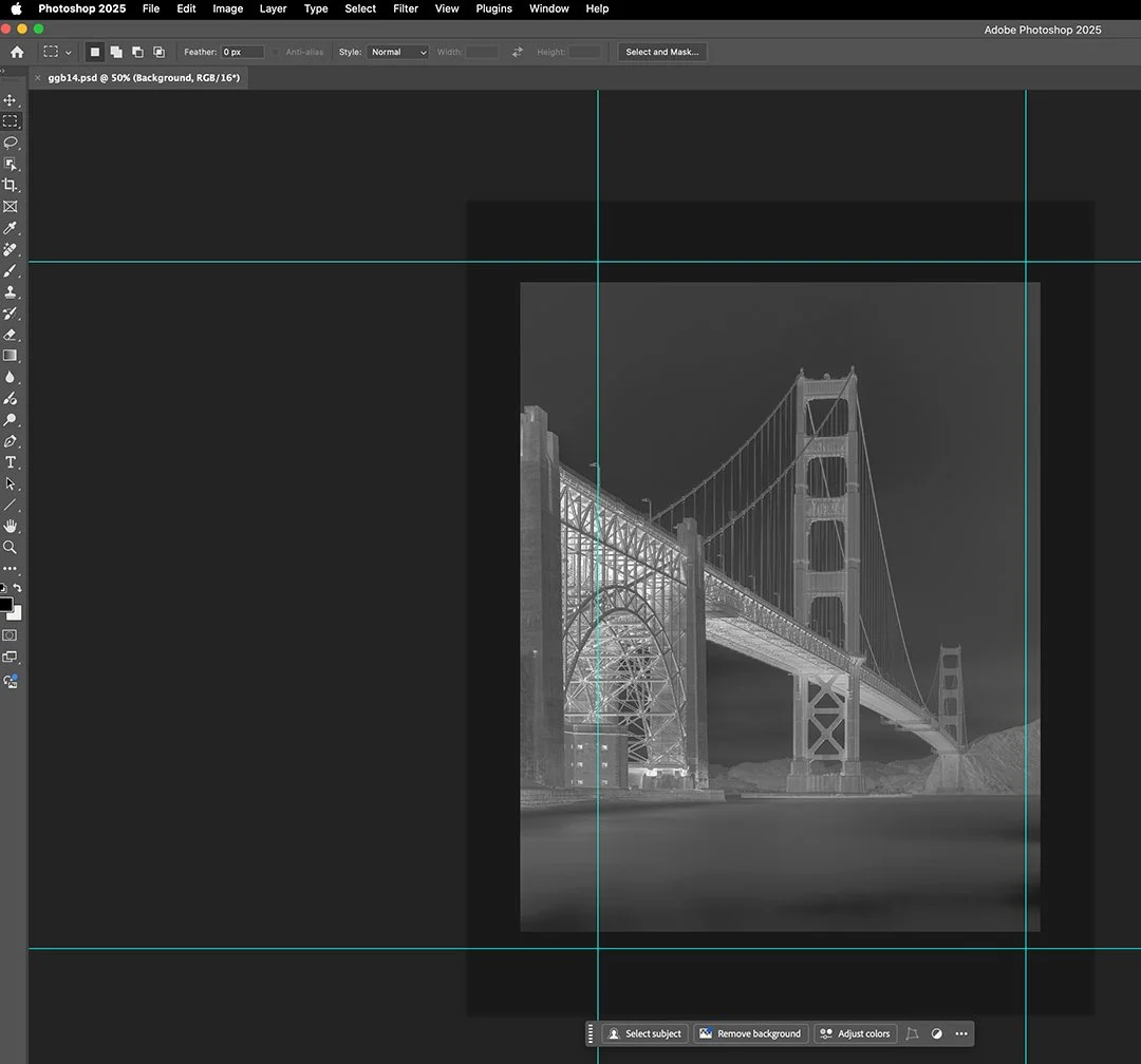 It all starts on the computer, where I make some initial edits to the digital photograph. I use Adobe Lightroom and Silver Efex Pro for this. I convert the file to black and white, crop if needed, and adjust the exposure and contrast to taste, aiming to make the file as close to my desired final image as possible. The image is then moved to Photoshop, where it is inverted (turned into a negative), rotated horizontally, and resized. This is a contact printing process, so the negative we create needs to be the same size as our final print. Lastly, a curve needs to be applied to the negative image to raise shadows and lower highlights. This ensures that the negative's density is calibrated to compensate for how silver gelatin paper reacts to light. I use the same default curve on all images and adjust contrast and exposure time in the darkroom to fine-tune the print. A great resource to learn more about curve creation and calibration is the book Silver Gelatin in the Digital Age by Douglas Ethridge. Once these steps are completed, the negative file is sent to my digital Epson printer to be printed onto transparency film.